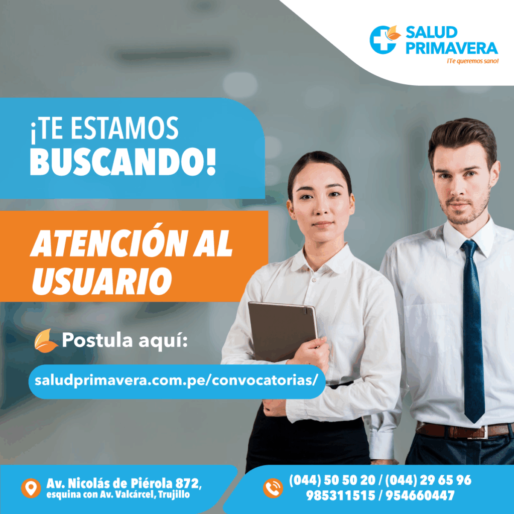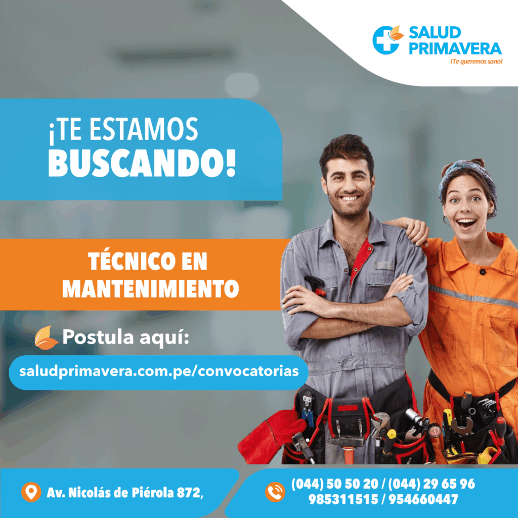 ConvocatoriasSalud Primavera2025-10-24T21:22:50+00:00 TECNICO EN MANTENIMIENTO Técnico en electricidad básica o plomería, Mecánica, Construcción, o afines. Conocimientos adicionales en pintura, melamina, drywall (deseable) Experiencia: 1 año en mantenimiento general Postula aquí ATENCION AL USUARIO Egresado de las carreras técnicas o universitarias de administración, comunicaciones, o afines. Experiencia mínima de 6 meses en servicio al cliente o cargos similares, en empresas del sector salud o de servicios. Capacidad organizativa y resolutiva, fluidez verbal y capacidad de negociación. Postula aquí